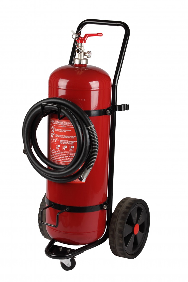 Leírás: 50 kg-os ABC 40% porral oltó tűzoltó készülék 5 m-es portömlővel, biztonsági szeleppel ellátott nyomásmérő órával.
