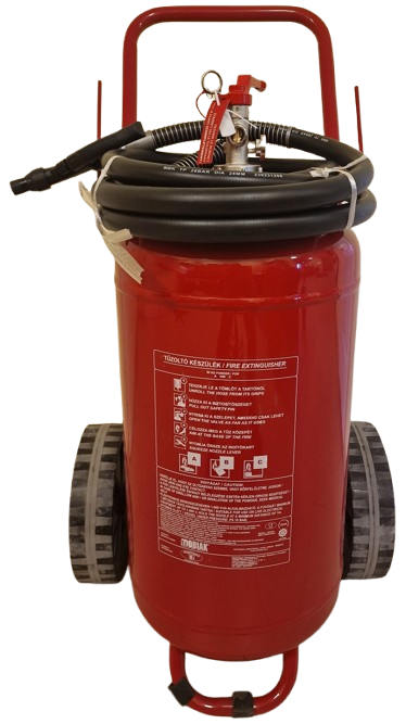 Leírás: 50 kg-os ABC 40% porral oltó tűzoltó készülék 5 m-es portömlővel, biztonsági szeleppel ellátott nyomásmérő órával.