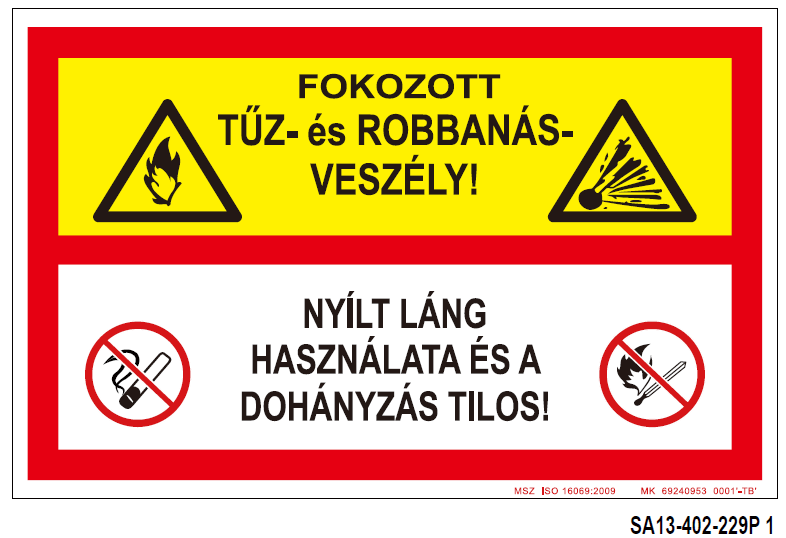 Fokozott tűz- és robbanásveszélyre figyelmeztető tábla, mely a dohányzás és nyílt láng használatát is tiltja.