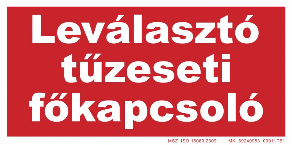 Leválasztó tűzeseti főkapcsoló helyét jelölő tábla.