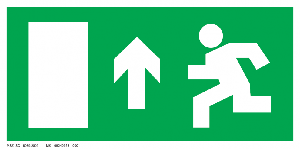Épületekben és szabadtéren alkalmazható menekülési útvonalat, menekülési útirányt jelző utánvilágító, öntapadó tábla.