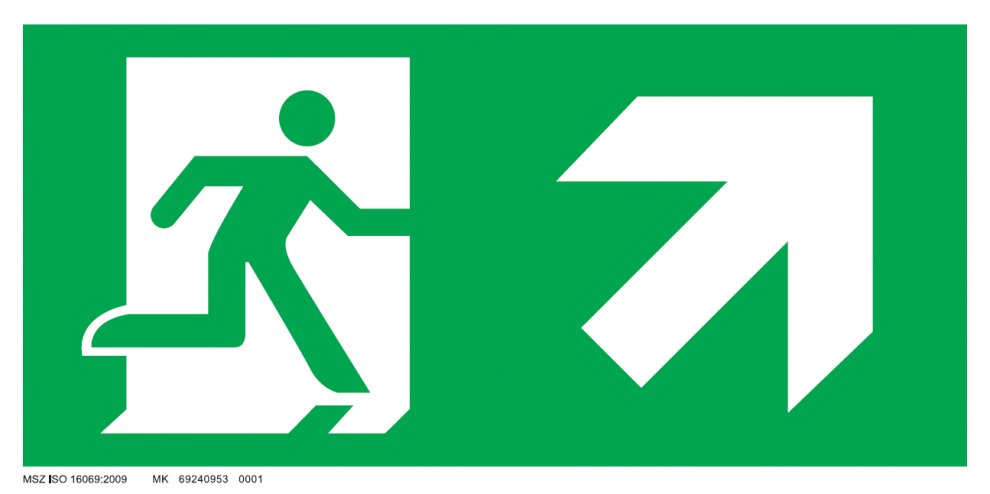 Épületekben és szabadtéren alkalmazható menekülési útvonalat, menekülési útirányt jelző utánvilágító, öntapadó tábla.