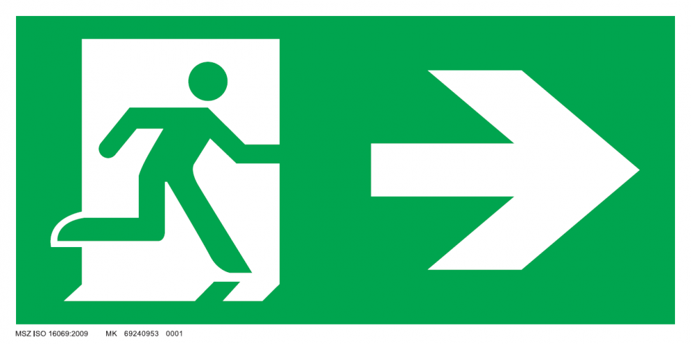 Épületekben és szabadtéren alkalmazható menekülési útvonalat, menekülési útirányt jelző utánvilágító, öntapadó tábla.