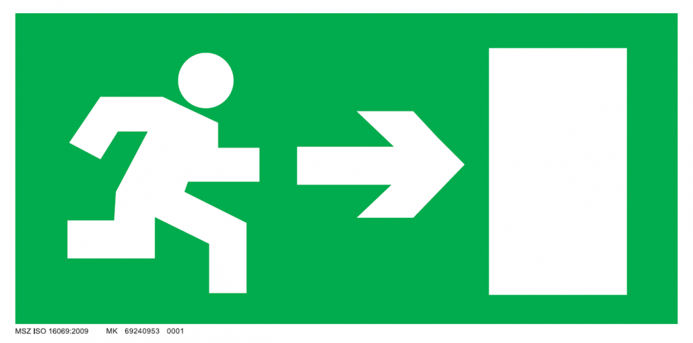 Épületekben és szabadtéren alkalmazható menekülési útvonalat, menekülési útirányt jelző utánvilágító, öntapadó tábla.