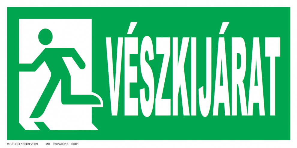 Az épület vészkijáratának jelölésére szolgáló menekülési útirány jelzés.