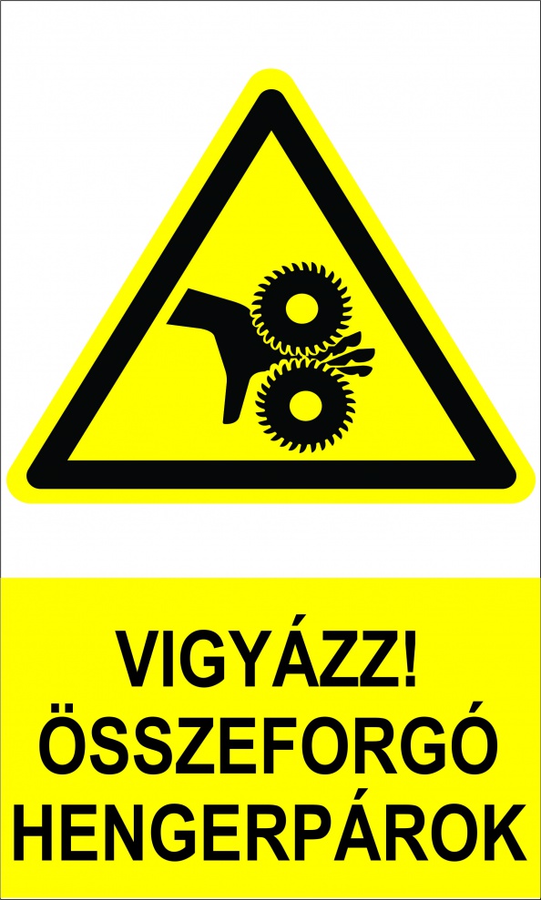 A gépeken található forgó hengerpárok okozta balesetveszélyre hívja fel a figyelmet, és kötelezően használatos ipari gépeken, présgépeken, nyomdagépeken, gyártósorokon; ez a jelzés segít megelőzni a zúzódásos sérüléseket.